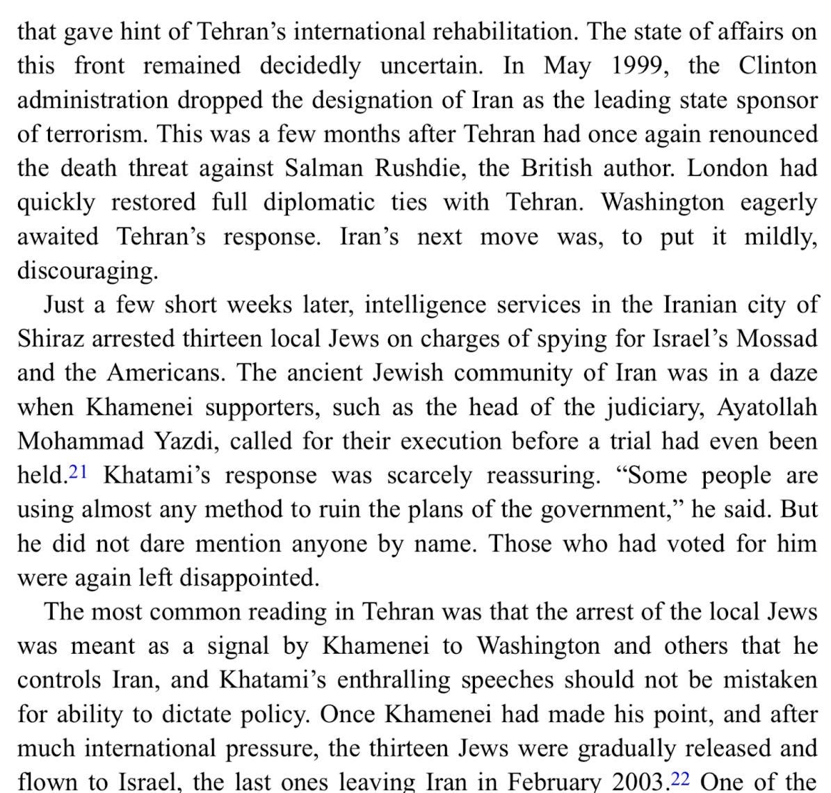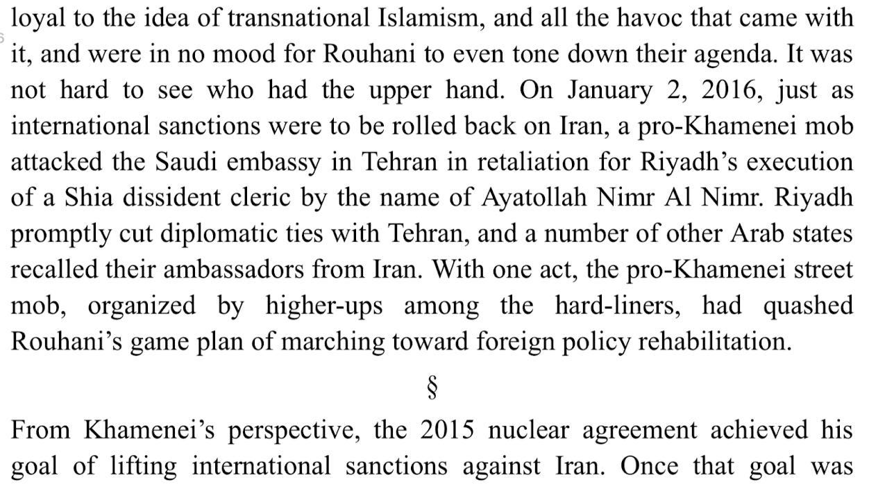 Finally, here are a few excerpts from Alex Vatanka’s excellent book The Battle of the Ayatollahs in Iran, which covers Iranian politics since 1979 through the lens of the relationship between Khamenei and Rafsanjani: